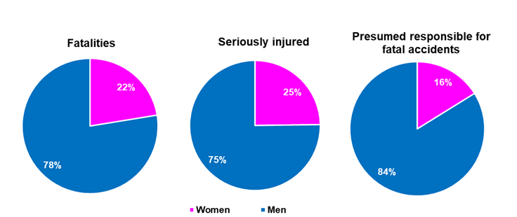 In 2025, of the 3,260 people who died on the roads, 2,526 were men and 734 were women. 77% of those who died in road accidents in mainland France were male. Thus, the proportion of men in road deaths remains predominant (77.5% compared to 77.2% in 2024, 77.3% in 2019 and 76.7% in 2018).