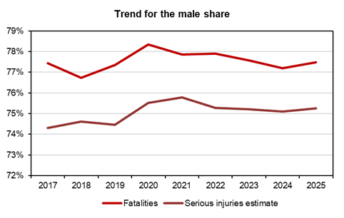 - There were 474 deaths among 25-34 year olds, an increase compared to 2024 (+33 fatalities) but a decrease compared to 2019 (-42 fatalities).