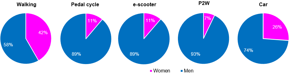 Regardless of the mode of transport, the proportion of men killed is consistently higher than that of women, but varies greatly depending on the mode of transport. Indeed, men account for between 58% of fatalities when walking, 74% when travelling in passenger vehicles, and 93% when travelling on motorised two-wheelers. Motorised two-wheelers are the mode of transport for which male over-mortality is most pronounced, regardless of the indicator analysed. However, this is to be expected, given the low number of women who drive motorised two-wheelers. Conversely, walking and passenger vehicles are the modes of transport for which mortality by gender is most consistent.