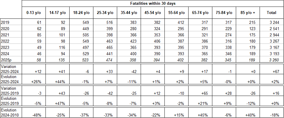 - 523 young adults aged 18-24 died, a lower figure than in 2024 (-6 fatalities) and 2019 (-26 fatalities); the number of fatalities among 18-24 year olds per million young people in this age group remains very high, at 95 fatalities per million inhabitants.