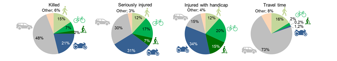 Since the pandemic, the proportion of vulnerable road users, i.e. those without motorised protection (pedestrians, cyclists, e-scooterists, users of powered two-wheelers) among those killed or seriously injured has increased.
