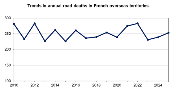 253 people died on the roads of overseas territories in 2025, 179 in overseas departments and regions and 74 in other overseas territories. This represents an increase of +6% (i.e. 14 more deaths) compared to 2024 and a stable result compared to 2019 (one fewer fatality).