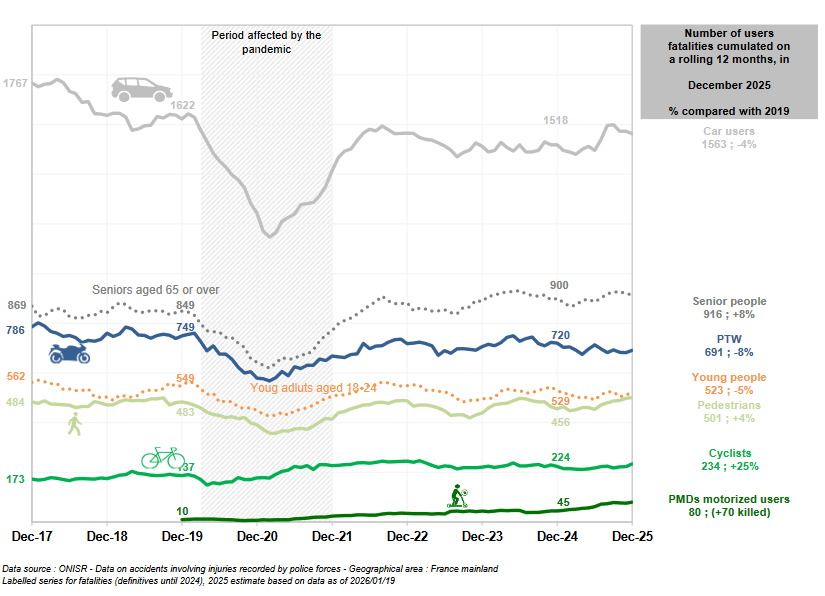 Mortality among seniors aged 65 and over is down compared to 2024 and 2019: 27 killed in 2025 compared to 32 killed in 2024 and 28 in 2019. Seniors remain much less represented than in France mainland.