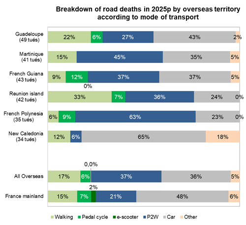 While the average proportion of deaths involving two-wheeled motor vehicles is 37% across all overseas territories, which is 16 points higher than in mainland France,