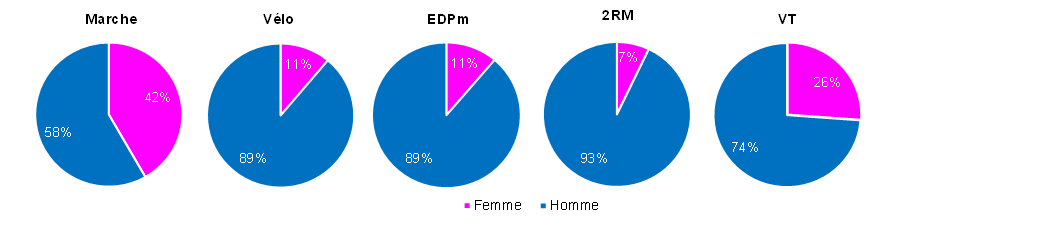 Quel que soit le mode de déplacement, la part des hommes tués est systématiquement supérieure à celle des femmes ; mais elle est très variable selon le mode de déplacement. En effet, les hommes affichent des proportions qui s’étalent de 58 % des tués dans le cas de la marche à pieds à 93 % dans le cas des deux-roues motorisés, en passant par 74 % dans le cas des véhicules de tourisme. Les deux-roues motorisés représentent le mode pour lequel la surmortalité masculine est la plus prononcée, quel que soit l’indicateur analysé. C’est toutefois attendu, au vu du faible nombre de femmes conductrices de deux-roues motorisés. À l’inverse, la marche à pied et les véhicules de tourisme sont les modes pour lesquels la mortalité selon le sexe est la plus homogène.