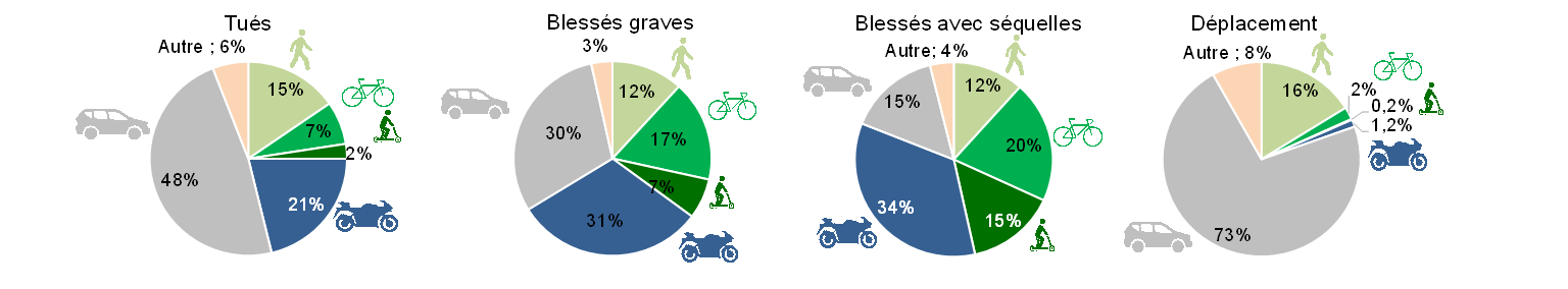 La part des usagers de deux-roues motorisés augmente : ces derniers représentent 23 % des personnes tuées, 32 % des blessés graves et 36 % des blessés qui garderont des séquelles 1 an après l’accident, pour moins de 2 % du trafic motorisé.