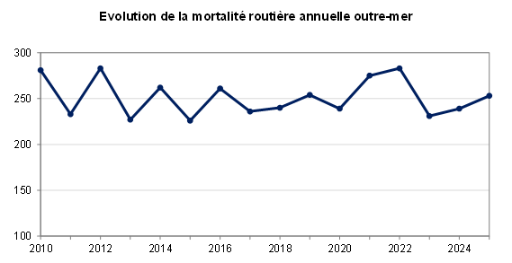253 personnes sont décédées sur les routes outre-mer en 2025 (207 hommes et 46 femmes), un résultat supérieur de + 6 % par rapport à 2024 mais équivalent à celui de 2019.