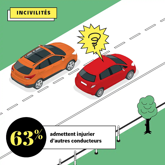 - 63 % admettent injurier d’autres conducteurs (50 % des conducteurs européens) ;