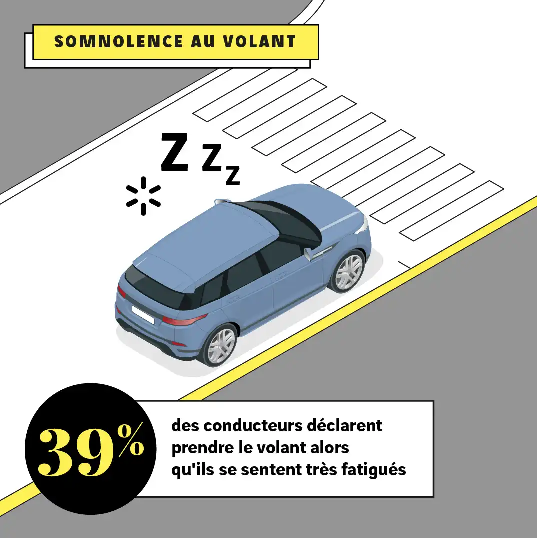 En France, la somnolence est davantage identifiée comme une cause d'accidents mortels sur autoroute que dans les autres pays d'Europe : 36 % contre 18 % dans les autres pays européens. Ainsi, 39 % déclarent encore prendre le volant alors qu'ils se sentent très fatigués (32 %) alors même que l'impact de cette fatigue est indéniable.