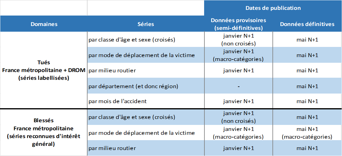 Ce sont les séries des nombres annuels nationaux de personnes tuées dans un accident de la route (jusqu'à 30 jours après l'accident) en France métropolitaine et dans les DROM ventilées selon les critères suivants (non croisés entre eux) :